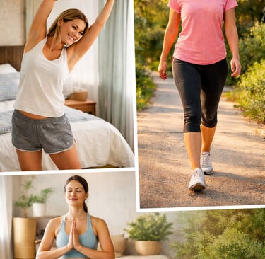 5–15 minutes of gentle stretches targeting the spine, hips, and shoulders. Relieves overnight tension and signals your body that the day has begun.