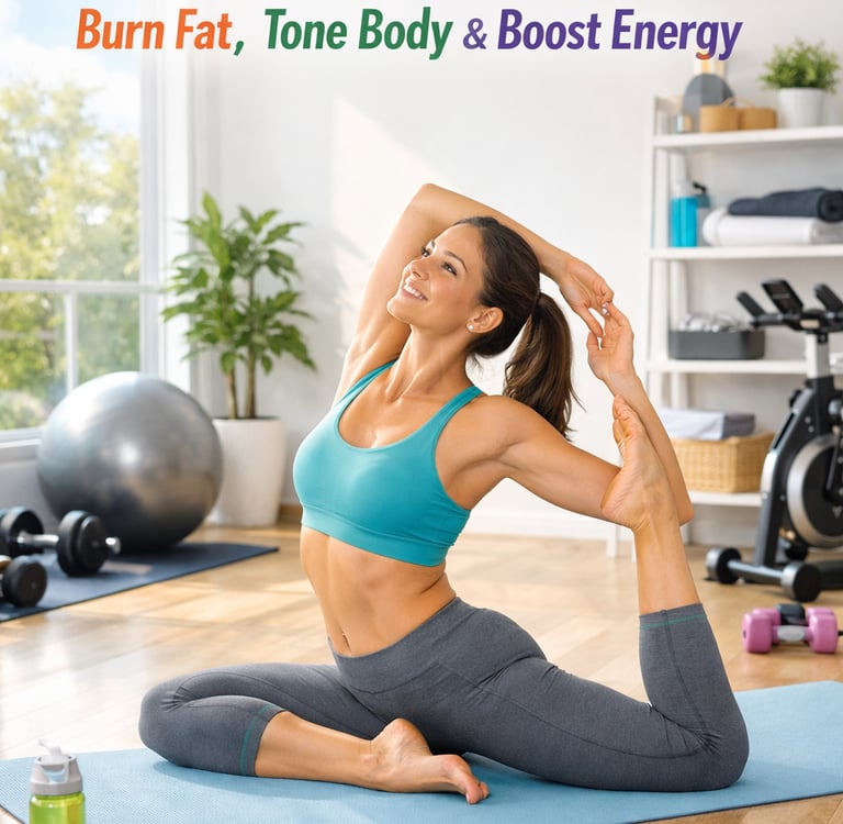 This yoga-at-home workout program focuses on burning fat, toning the body, and boosting energy in a way that feels sustainable, calming, and realistic. Instead of pushing your body to exhaustion, this routine works with your body—supporting strength, flexibility, balance, and mental clarity.