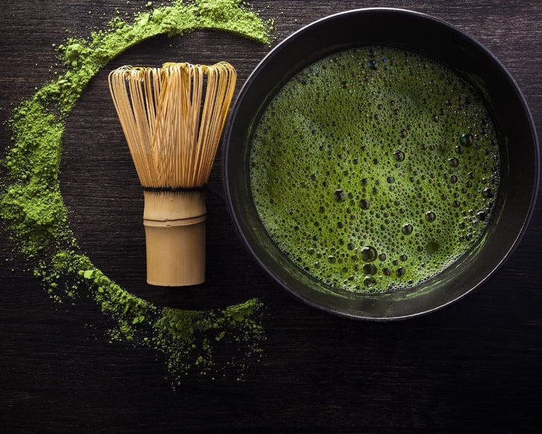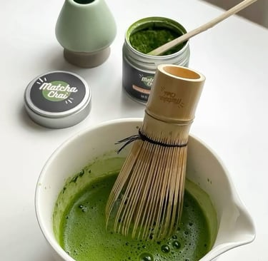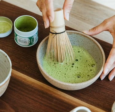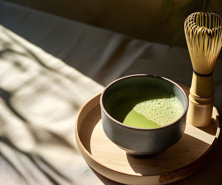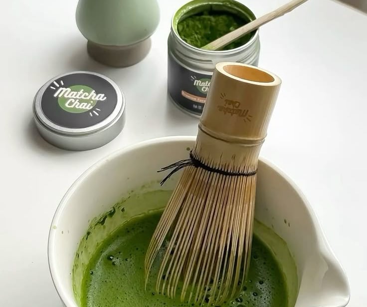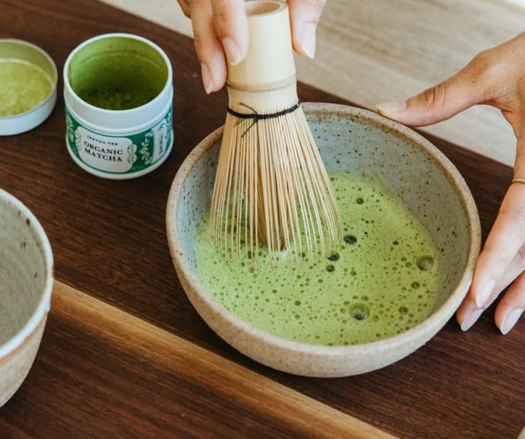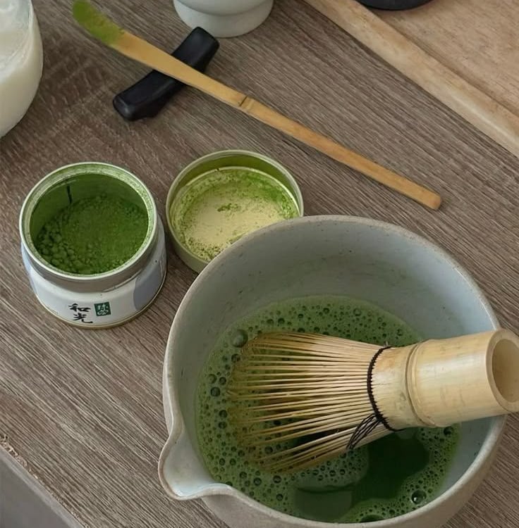 I take a small amount of hot water—not boiling, because that can make matcha bitter—and whisk the powder gently until it becomes smooth and almost silky. There’s something incredibly calming about this step. The way the powder transforms, the soft movement of the whisk, the quiet focus it requires—it turns the whole process into a moment just for you.