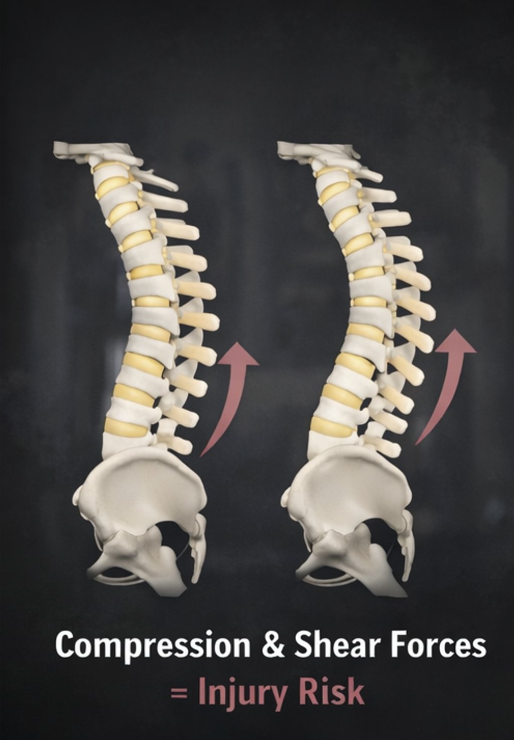 The potential issue arises when you combine compression with repeated spinal flexion under load. When you flex and compress at the same time, you introduce shear forces. Over time—rep after rep, session after session—that combination can increase the stress placed on spinal structures.